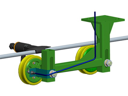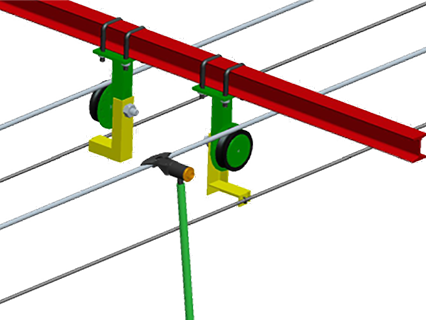 在托輪的下方全線路上設(shè)置一根鋼絲繩,當(dāng)?shù)跻伟l(fā)生過擺時(shí),防過擺的鋼絲繩將吊椅擋回去,使吊椅恢復(fù)正常位置。