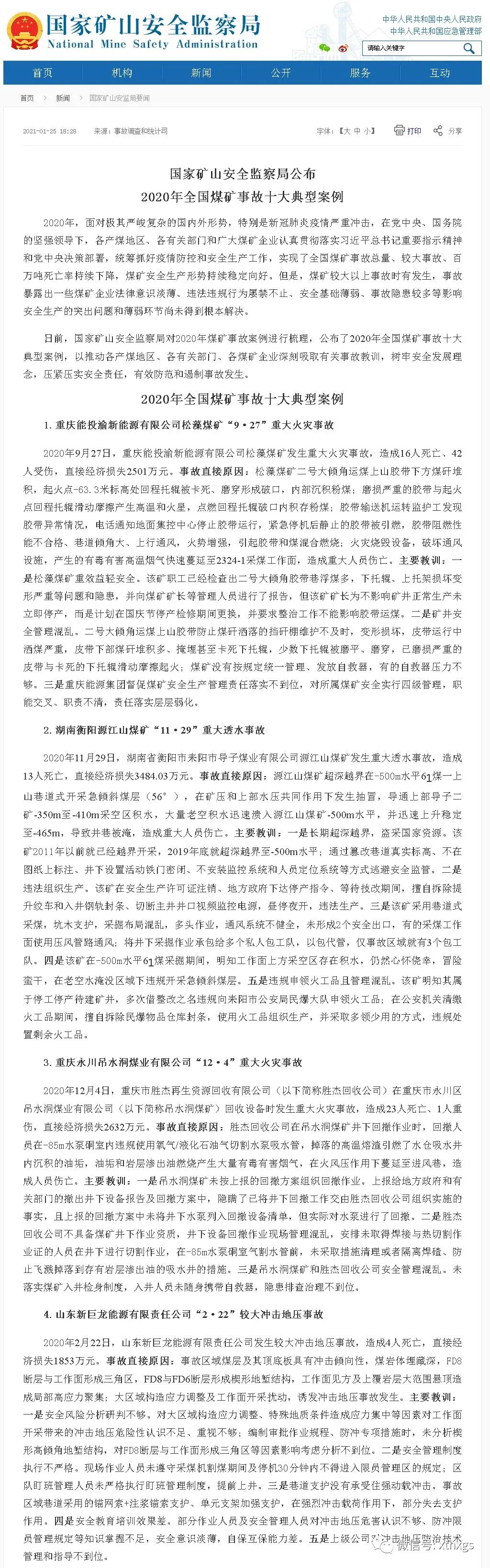轉載:國家礦山安全監(jiān)察局公布2020年全國煤礦事故十大典型案例