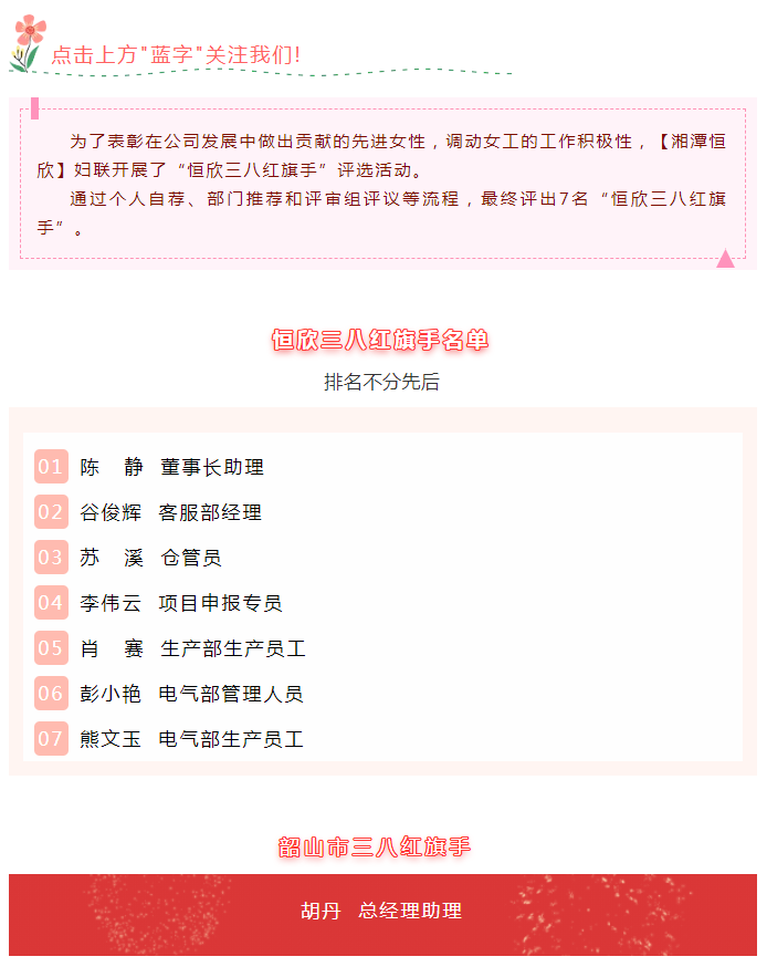 xiao12666@163.com【湘潭恒欣】婦聯(lián)開展“三八紅旗手”評(píng)選活動(dòng)