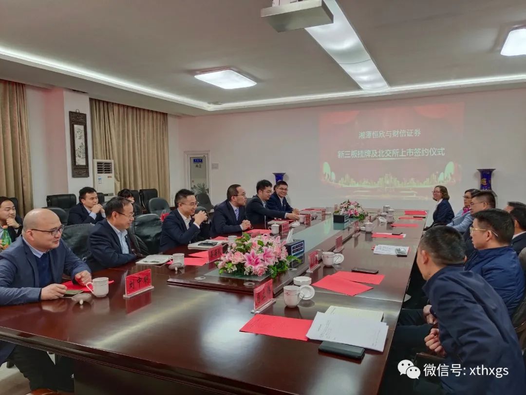 參觀后進(jìn)入會(huì)議室觀看企業(yè)宣傳片,肖董事長(zhǎng)向龍海彧副總裁一行的到來(lái)表示歡迎并簡(jiǎn)要介紹公司的情況和發(fā)展規(guī)劃。隨后龍海彧副總裁和李云祥副首席代表分別進(jìn)行了致辭,韶山市副市長(zhǎng)易繼輝發(fā)表了講話(huà)。并在大家的見(jiàn)證下,【湘潭恒欣】肖公平和財(cái)信證券副總裁龍海彧簽訂了新三板掛牌及北交所上市協(xié)議。