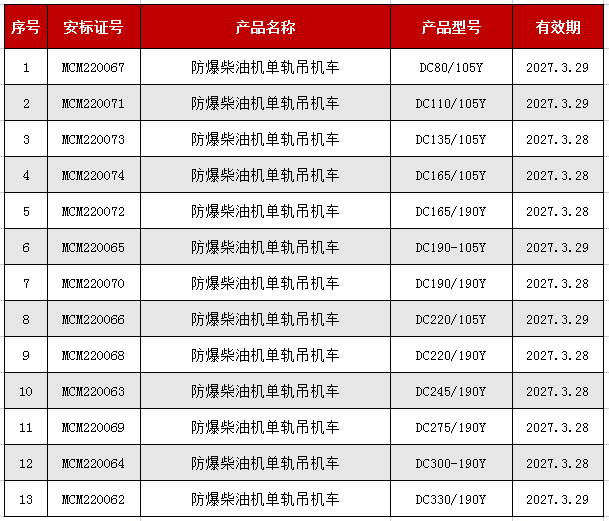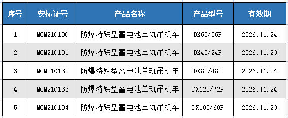 【湘潭恒欣】再獲13個防爆柴油機單軌吊機車安標證