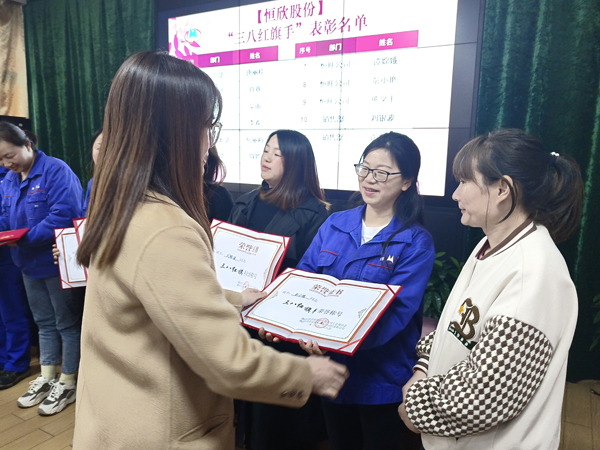 首先由【恒欣股份】婦聯(lián)主席胡丹宣布了關(guān)于表彰【恒欣股份】三八紅旗手的決定以及獲獎名單。隨后工會主席李繼偉向“三八紅旗手”們給予了肯定,也提出的期望。最后總經(jīng)理肖薇向“三八紅旗手”們表示感謝,感謝她們?yōu)椤竞阈拦煞荨康陌l(fā)展而辛勤的工作,也感謝她們背后的家人們的理解和支持。在大家的見證下,總經(jīng)理肖薇為11名“三八紅旗手”頒發(fā)了榮譽證書和獎金。