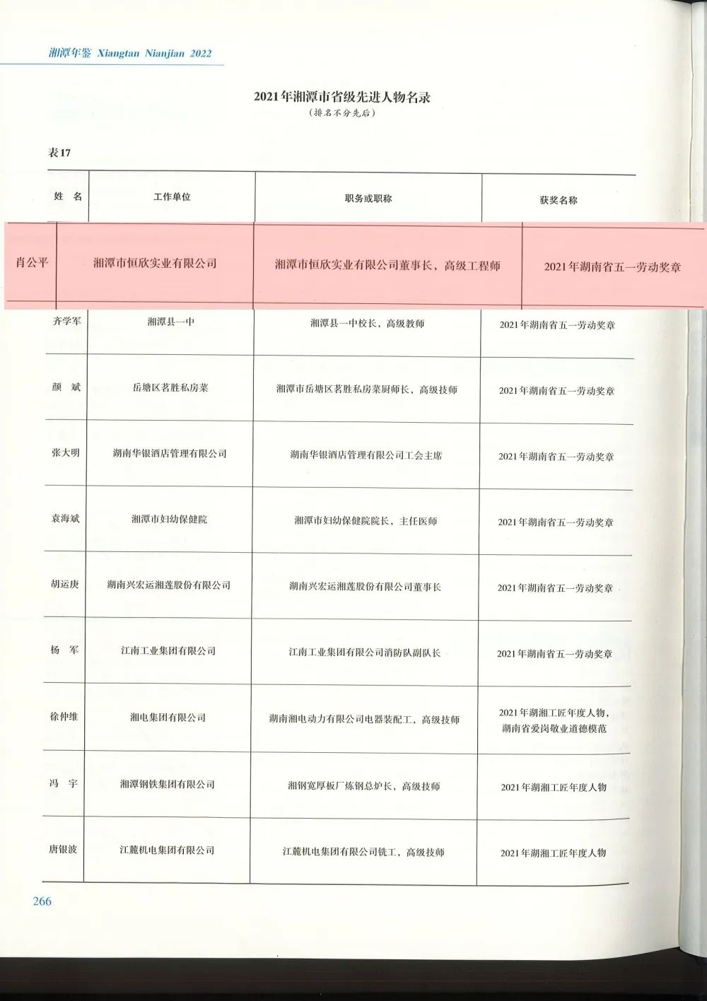 2022年出版的《湘潭年鑒》多個章節(jié)收錄了【恒欣股份】在科學技術、經(jīng)濟發(fā)展等方面取得的成績,董事長肖公平榮獲2021年湖南省五一勞動獎章被收錄在《湘潭年鑒》"2021年湘潭市省級先進人物名錄“中。