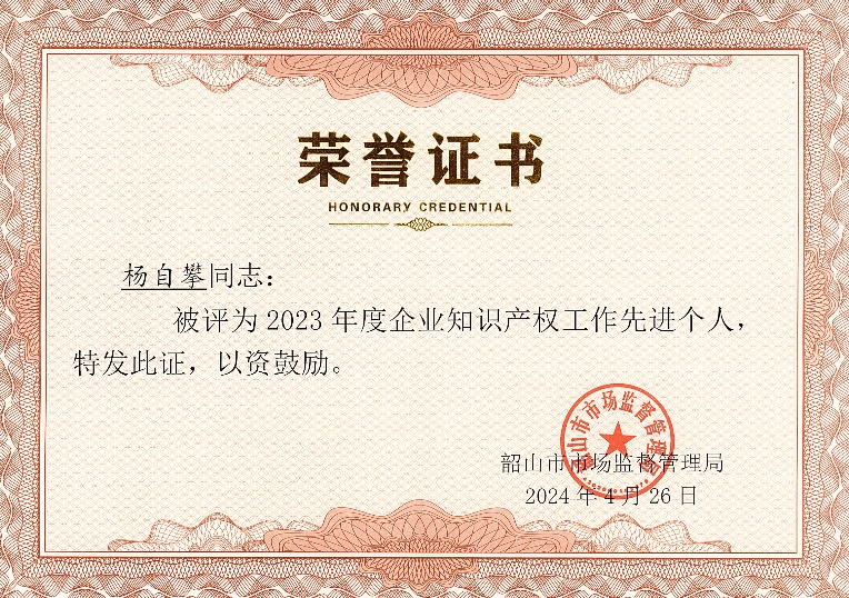 4月26日,韶山市委宣傳部和韶山市市場監(jiān)督管理局等單位聯(lián)合主辦了韶山市2024年“知識產(chǎn)權(quán)宣傳周”主題活動?;顒蝇F(xiàn)場上,由韶山市委常委、副市長鄒正光為榮獲知識產(chǎn)權(quán)榮譽的企業(yè)和個人進行頒獎和授牌。董事長肖公平接受鄒副市長為【恒欣股份】獲評國家知識產(chǎn)權(quán)示范企業(yè)的授牌,【恒欣股份】知識產(chǎn)權(quán)辦主任楊自攀被評為企業(yè)知識產(chǎn)權(quán)工作先進個人。
