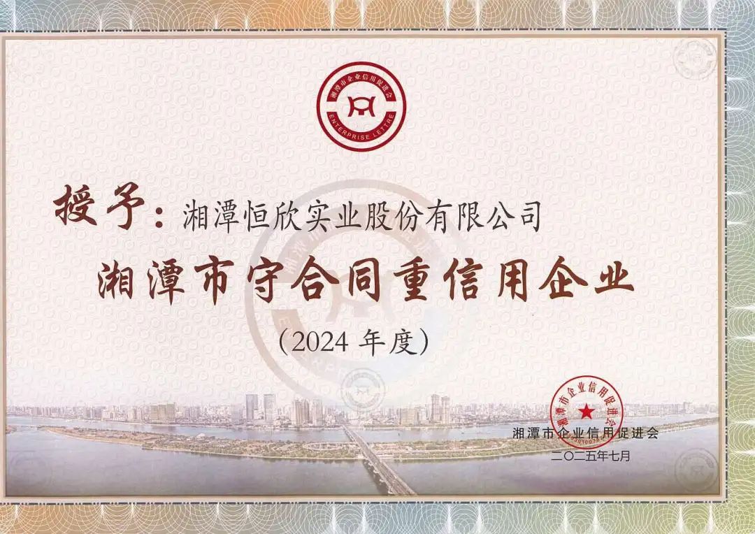 喜訊!【恒欣股份】近日成功獲評“2024年度湖南省守合同重信用企業(yè)”和“2024年度湘潭市守合同重信用企業(yè)”!這是公司連續(xù)第十二年榮獲此項(xiàng)殊榮。
