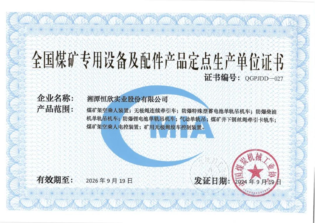 【恒欣股份】二十多年來一直深耕礦山軌道運(yùn)輸智能裝備行業(yè),先后榮獲國家專精特新“小巨人”首批重點支持企業(yè)、全國市場用戶滿意標(biāo)桿企業(yè)、第六屆湖南省省長質(zhì)量獎、國家綠色工廠,礦用“猴車”榮獲單項冠軍產(chǎn)品、礦用單軌吊榮獲綠色礦山礦業(yè)裝備質(zhì)量金獎。