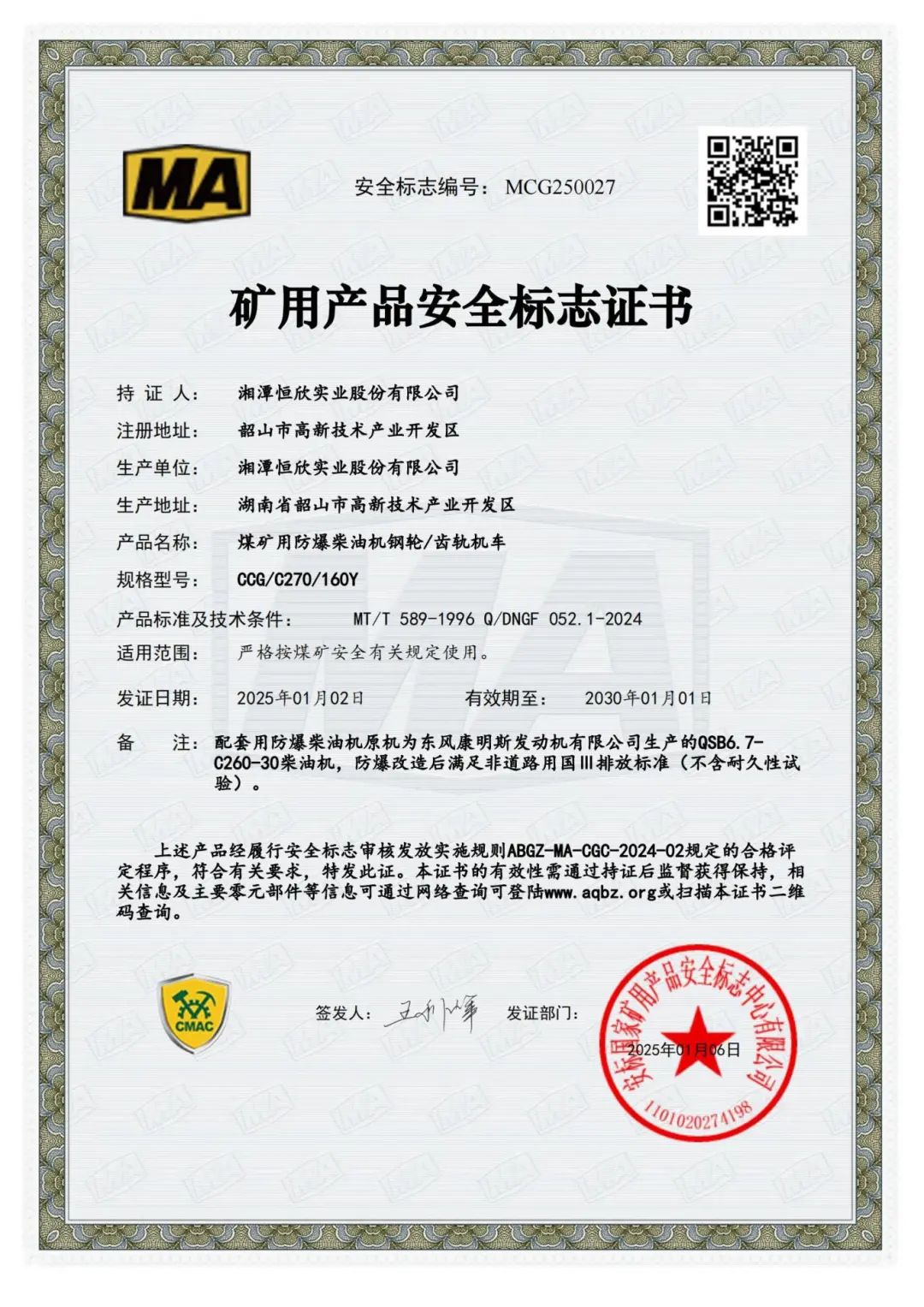 本次取得的三款型號(hào)的齒軌卡軌車煤礦用產(chǎn)品安全標(biāo)志證書,是公司研發(fā)的新型煤礦用防爆柴油機(jī)齒軌機(jī)車,其最大牽引力達(dá)538KN,是目前國內(nèi)牽引力最大的齒軌機(jī)車;還具有爬坡能力強(qiáng)、自動(dòng)化程度高、安全制動(dòng)性好、運(yùn)輸效率高等顯著技術(shù)優(yōu)勢。