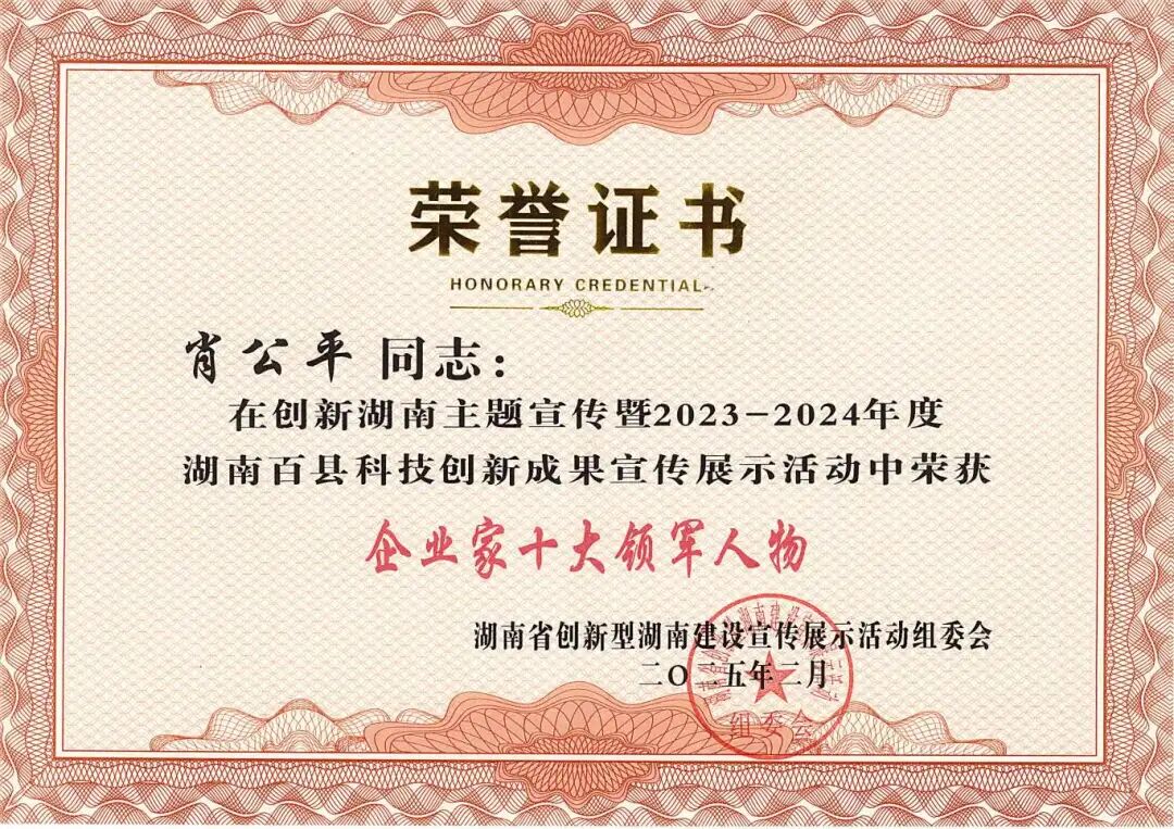 在“創(chuàng)新湖南主題宣傳暨2023-2024年度湖南百縣科技創(chuàng)新成果宣傳展示活動(dòng)”中,【恒欣股份】董事長肖公平榮獲“企業(yè)家領(lǐng)軍人物”稱號(hào)。