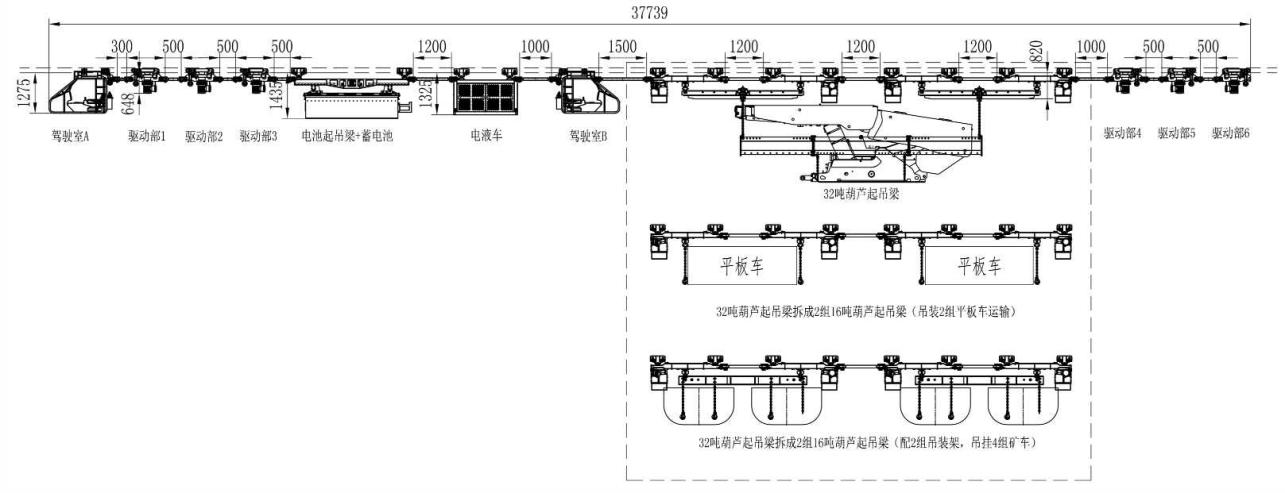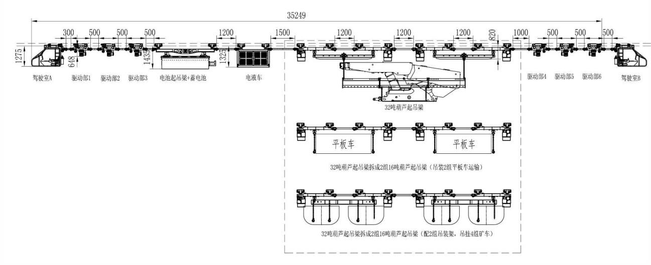 方式二:起吊梁位于最前端位置,適用于直接將液壓支架運輸?shù)焦ぷ髅媲醒畚恢眠\輸方式,采用葫蘆驅動形式起吊梁,也可拆解為小噸位起吊梁,用于運輸平板車、礦車等小型貨物。