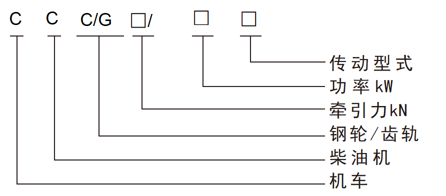 示例:CCG / C 5 3 8 / 1 6 0 Y:煤 礦 用 防 爆 柴 油 機(jī) 鋼 輪/齒 軌 機(jī) 車 ,牽 引 力53 8 kN ,柴 油 機(jī) 功 率 160kW, 液壓傳動(dòng)。