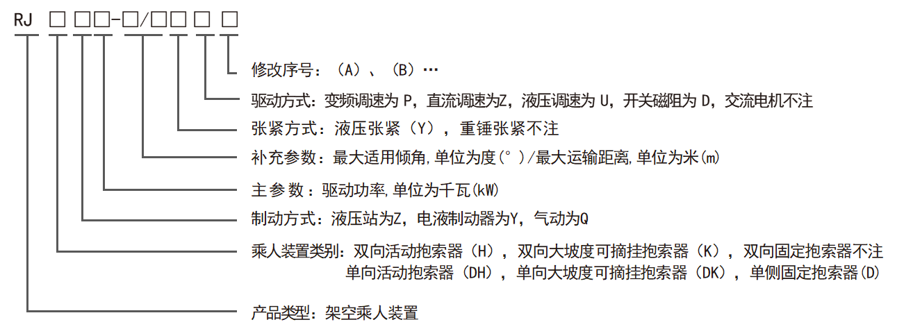 示例:采用交流電機(jī)傳動(dòng),電液制動(dòng)器制動(dòng)和重錘張緊,最大適用傾角18°,最大運(yùn)輸距離600m,驅(qū)動(dòng)功率為22kw的活動(dòng)抱索器架空乘人裝置:RJHY22~18/600(A)。