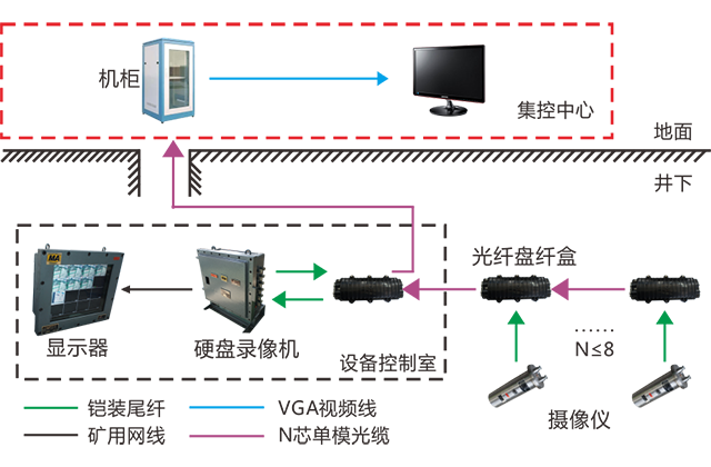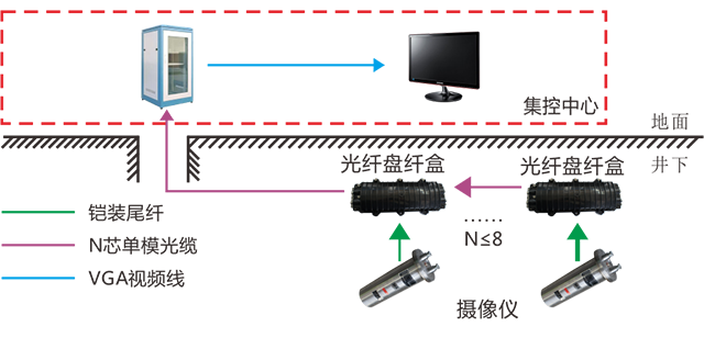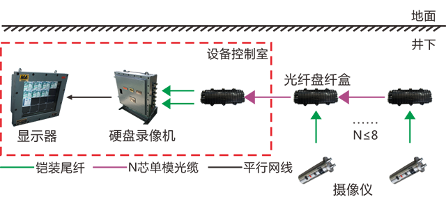 況進行實時監(jiān)視,硬盤錄像機通過光纖接收視頻信號,通過顯示器進行顯示和切換,實現(xiàn)地面和井下視頻信號實時顯示和存儲的目的。